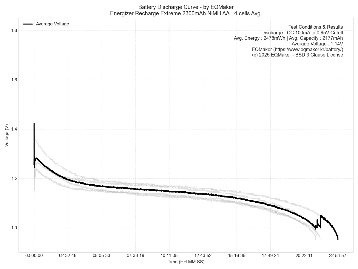 에너자이저 리차지 익스트림 AA 니켈수소 충전지 2셀을 이용해 4회 방전 테스트한 결과, 셀당 평균 전력은 2478mWh, 평균 용량은 2177mAh로 측정되었습니다.