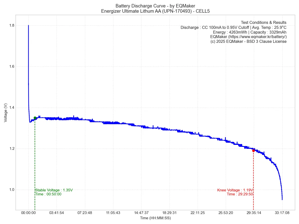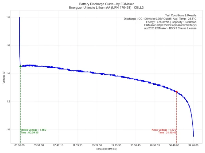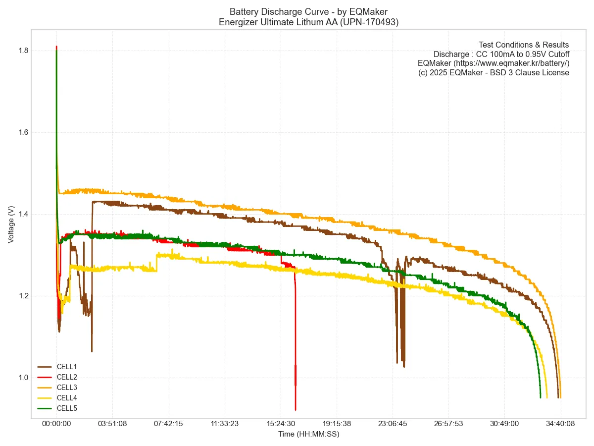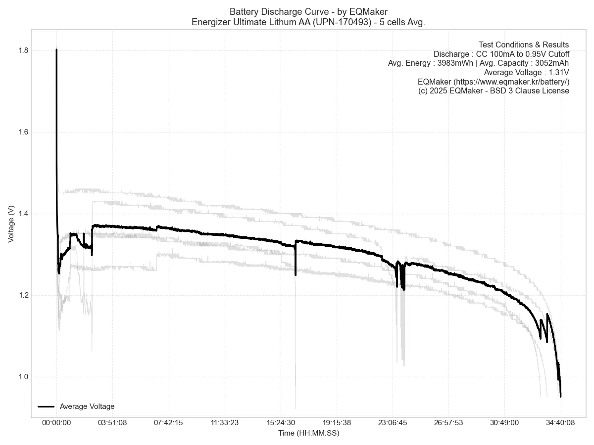 에너자이저 얼티메이트 리튬 AA 리튬철 건전지(UPN-170493) 5셀을 이용해 5회 방전 테스트한 결과, 셀당 평균 전력은 3983mWh, 평균 용량은 3052mAh로 측정되었습니다.