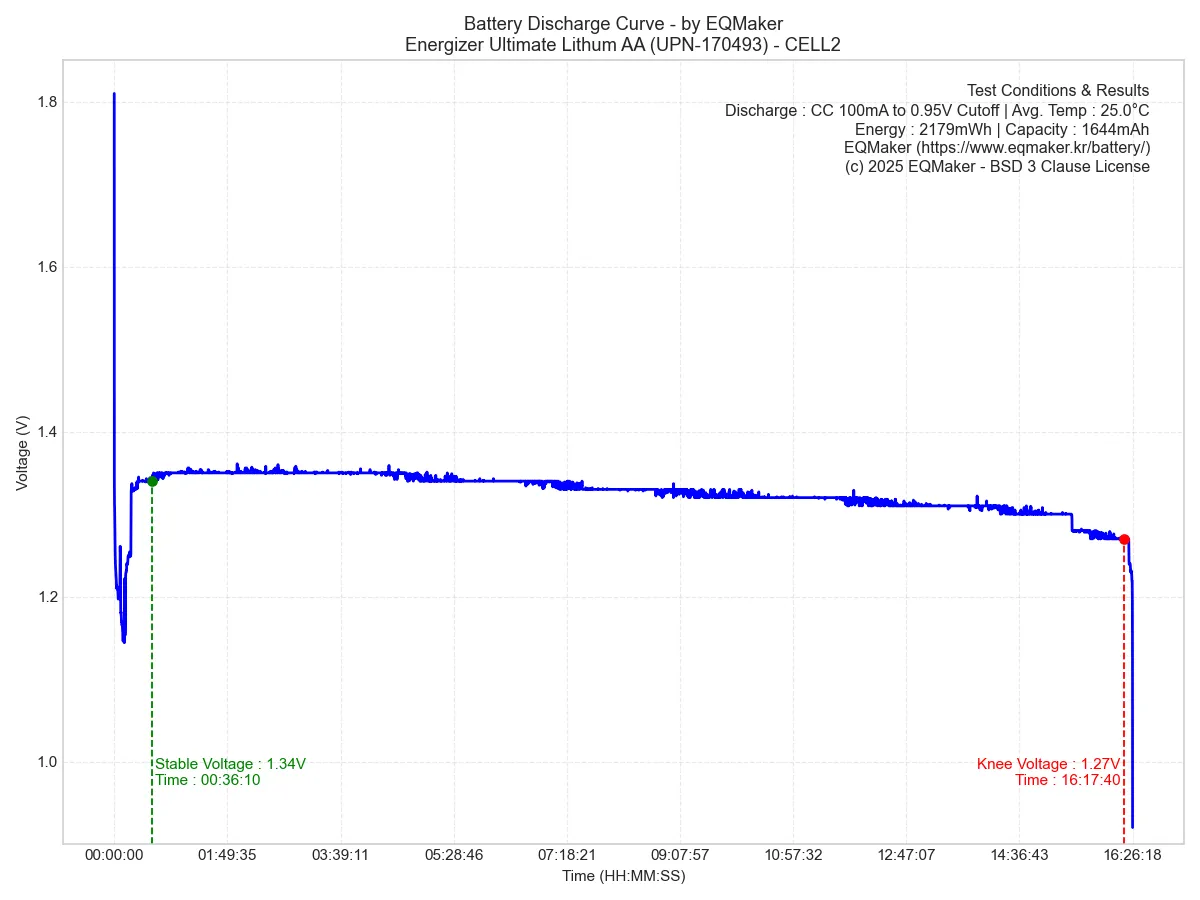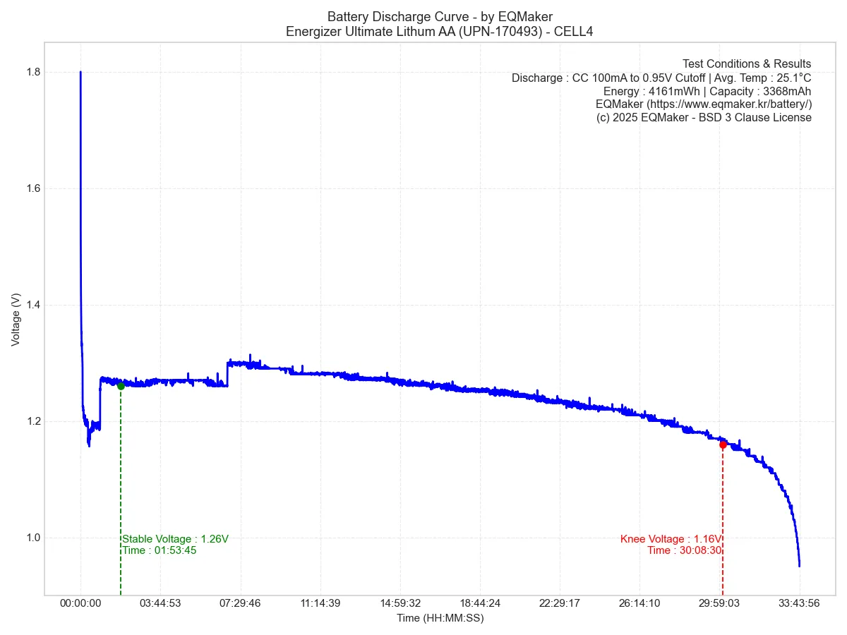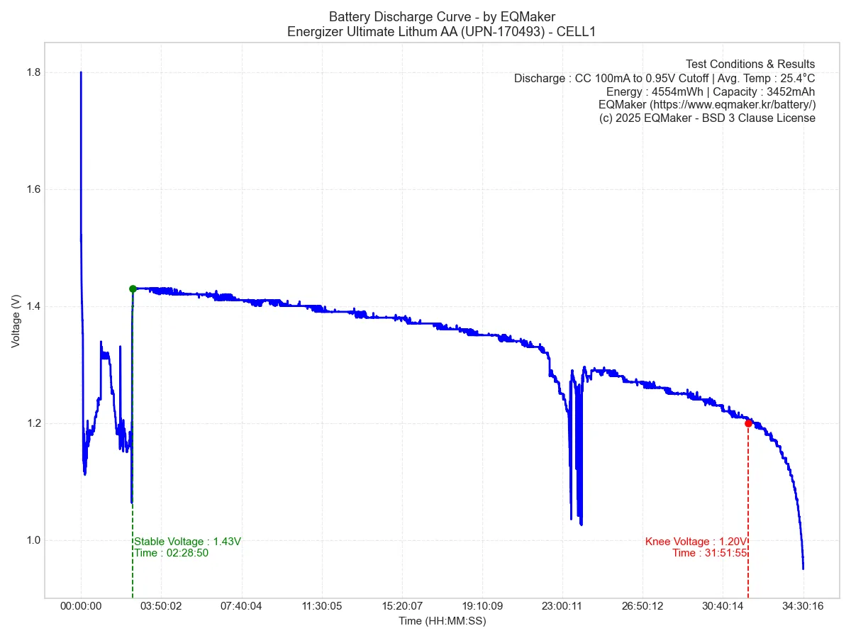 에너자이저 얼티메이트 리튬 AA 리튬철 건전지(UPN-170493)의 테스트 결과를 표와 그래프로 정리합니다.