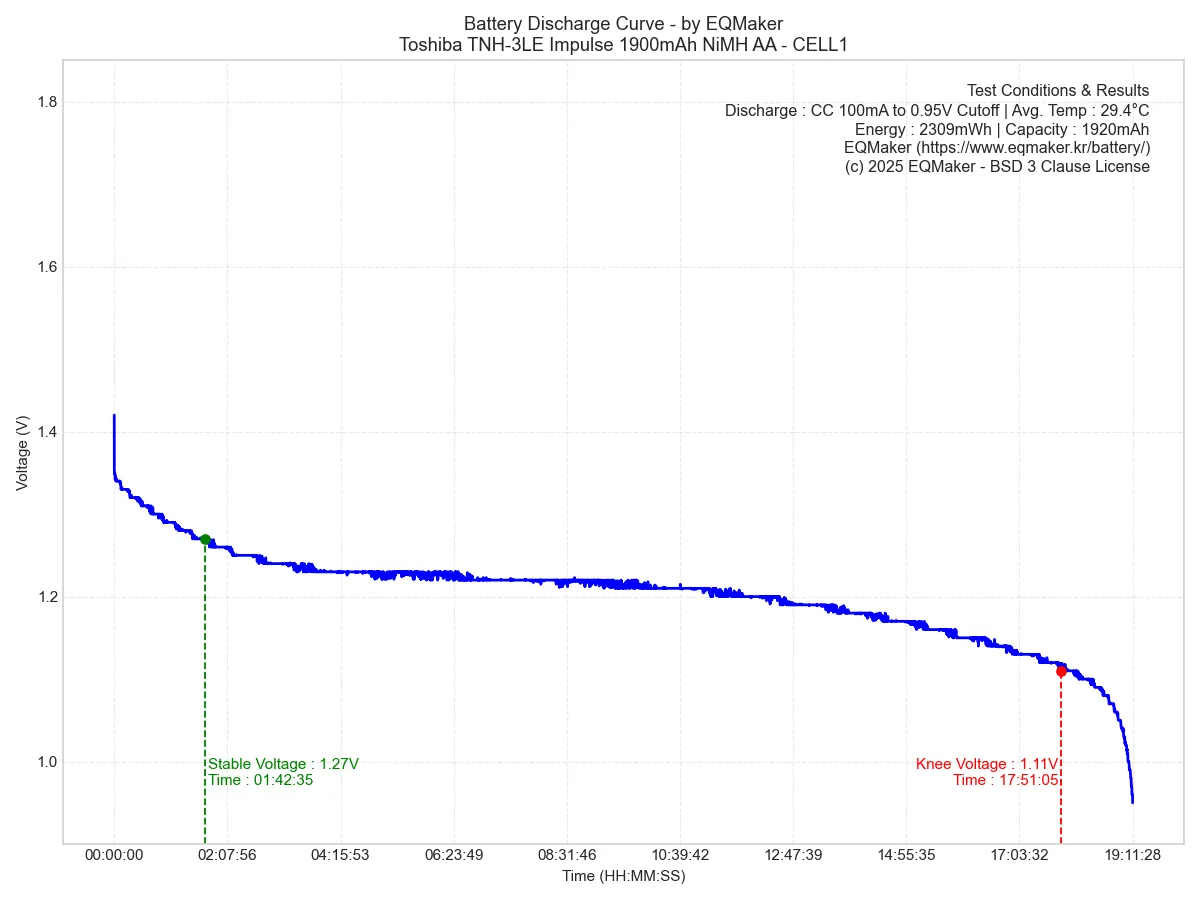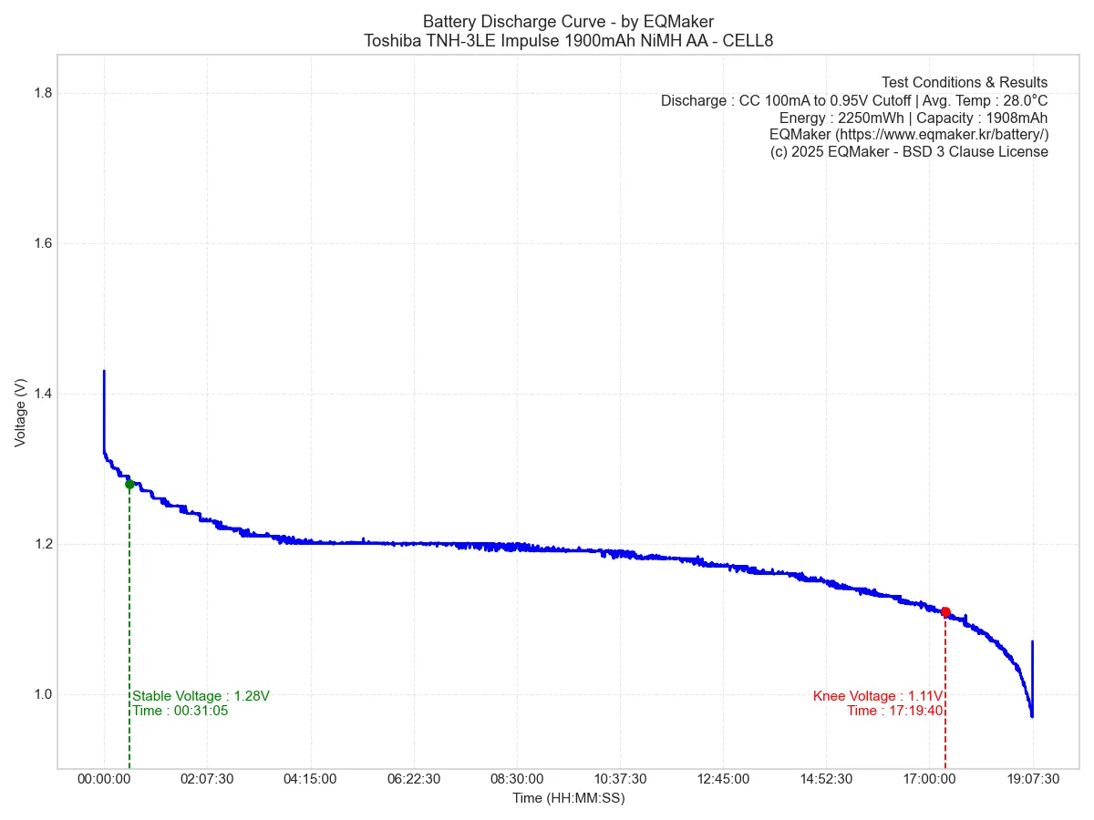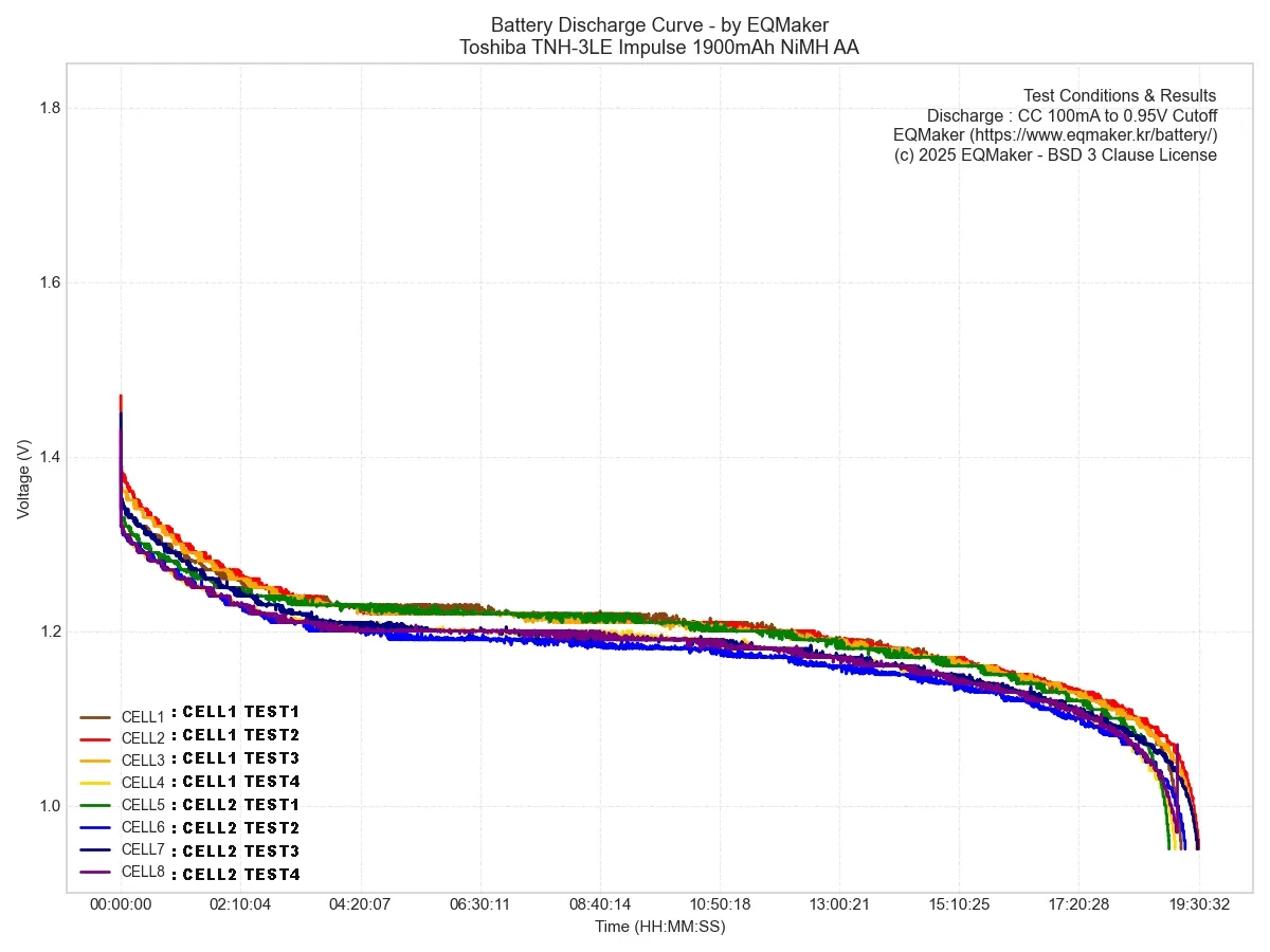 도시바 TNH-3LE 임펄스 1900mAh AA 니켈수소 충전지 용량 테스트 RAW 데이터 다운로드