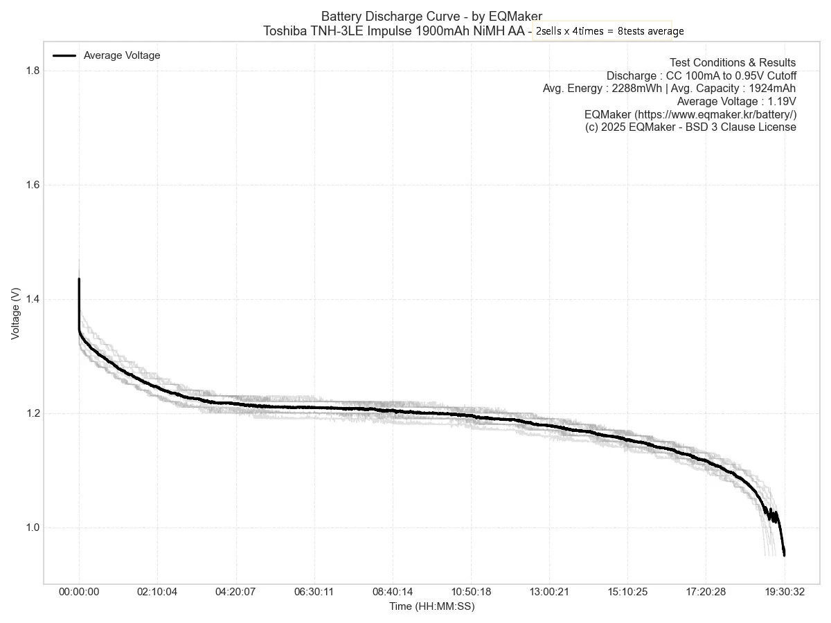 도시바 TNH-3LE 임펄스 1900mAh AA 니켈수소 충전지 2셀을 이용해 8회 방전 테스트한 결과, 셀당 평균 전력은 2288mWh, 평균 용량은 1924mAh로 측정되었습니다.