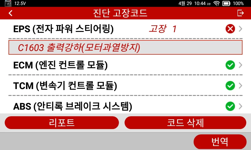 이게 뭔가 싶어 EPS(전자 파워 스티어링) 항목을 클릭해 보니, 고장코드와 함께 고장 이름이 표시되었다.