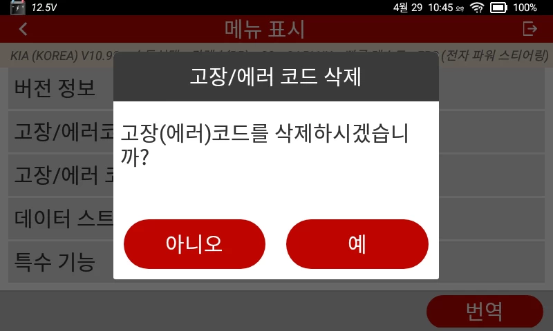 다행스럽게 본 필자의 진단기에는 고장코드 삭제 기능이 있어 바로 삭제 작업을 진행하기로 했다. 전자 파워 스티어링 모듈을 선택하면 나오는 하위 메뉴에서 고장/에러코드 삭제를 선택해 주었다.
