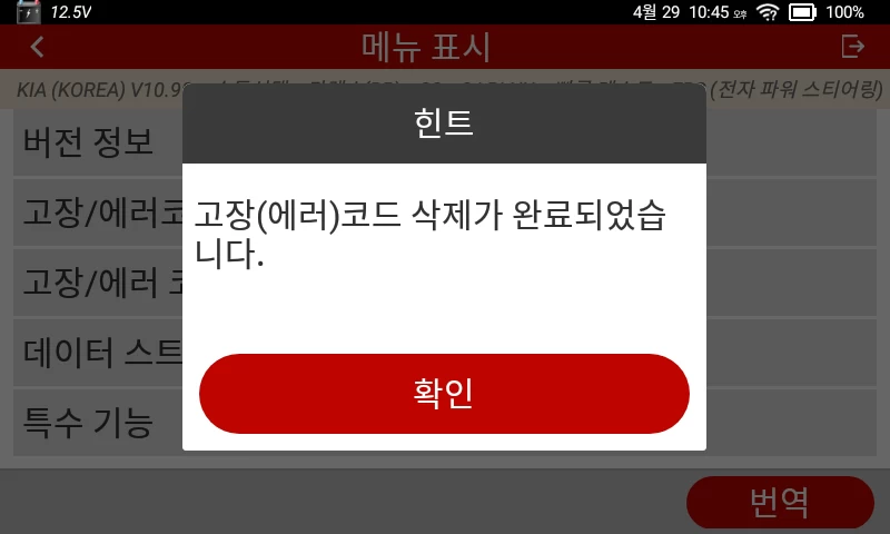 고장 코드를 삭제할 것인가 묻는 질문에 당연히 예를 눌러주면, 고장(에러)코드 삭제가 완료되었습니다.라는 창이 나타난다.