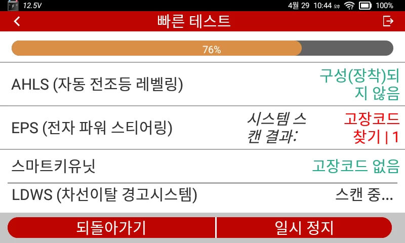 큰 마음을 먹고 구매한 차량 진단기 사용 방법을 공부하기 위해 퇴근 후 종종 차에 가서 진단기를 연결해 이것저것 확인을 하던 어느 날, 이제까지 완전 깨끗했던 테스트 결과 목록에 빨간 색으로 고장코드 찾기라는 메시지가 표시되는 것을 발견했다.